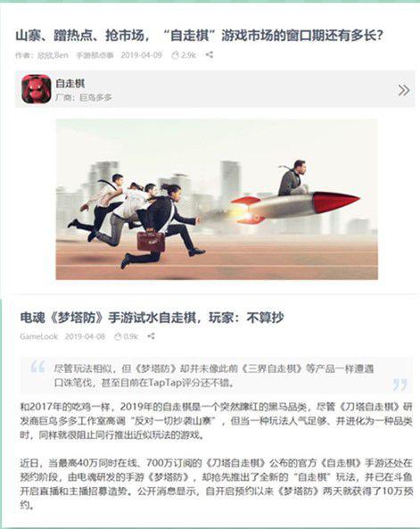 刚才,认真学习了《电魂<梦塔防>手游试水自走棋,玩家:不算抄》(GameLook)和《山寨、蹭热点、抢市场,“自走棋”游戏市场的窗口期还有多长?》(作者:欣欣,Ben 手游那点事)两篇文章,我都非常赞同。前一篇更加生动的阐述了自走棋类游戏应百花齐放,形成竞争才能推动游戏向更高品质发展的道理。后一篇则是详细的介绍了目前市场上出现的数十款“致敬”DOTA2自走棋的手游产品,同时也提醒开发自走棋的中小团队要抓紧时间了,不久将被大厂碾压。
