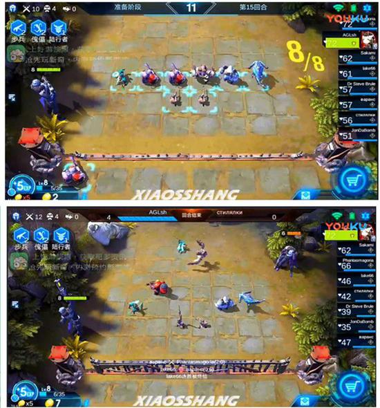 3. 《AECH》的竖向界面延续了DOTA2自走棋界面近大远小的视觉表现效果(我方棋面、棋子都比较大,对方则较小),让画面更有深度,场面也显得更加宏大,主场感觉更明显(“主场感觉”大家可以类比足球主客场氛围)。 《梦塔防》的横向界面画面相较就呆板些。