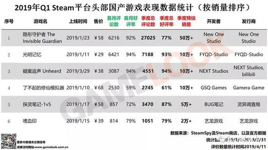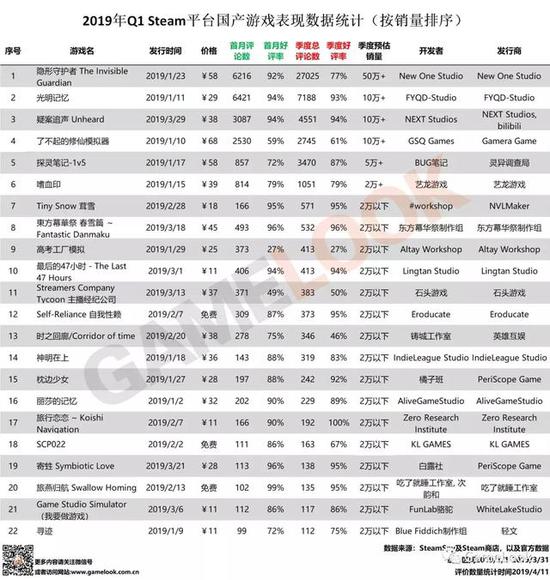以下是2019年Q1 Steam上线的部分国产游戏概览(依据季度预估销量排序、评价数量大于100条),笔者将对其中表现突出的游戏做简要的点评: