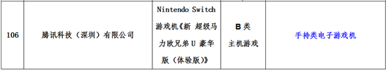 今天,广东省文化和旅游厅官网公布一则《2019年第一季度广东省游戏游艺设备内容审核通过机型机种目录》公示消息,公示内显示任天堂Switch游戏机《新超级马里欧兄弟U 豪华版(体验版)》手持类电子游戏机将由腾讯科技代理。