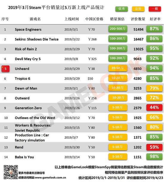 值得一提的是,3月份的国产游戏,仅有销量20万以上的《Unheard 疑案追声》1款上榜。