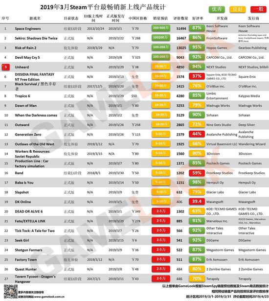 以下是2019年3月Steam平台累积销量超过2万套的新上线产品统计表,数据来源于SteamSpy及Steam商店。