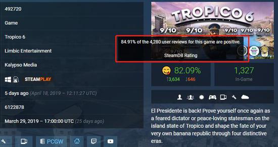 出于某些原因,《海岛大亨6》没有在中国区上线,但是成绩依然十分不错,目前为止有4280条好评,好评率高达85%。同时SteamSpy的预估销量为10-20万。