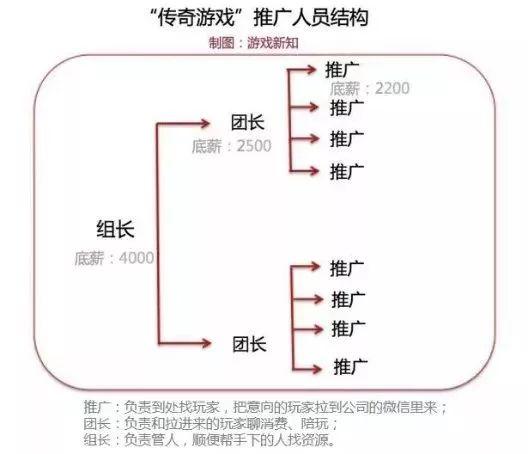 游戏公会推广人员往往是三级结构,初级推广——团长——组长,分工明确,各司其职。据方时茂介绍,其所在的公司,规模在50人左右,组长一共有5个,每个组长大致配2个团长和8个推广。推广负责到处找玩家,把意向的玩家拉到公司的微信里来;团长负责和拉进来的玩家聊消费、陪玩;组长负责管人,顺便帮手下的人找资源。