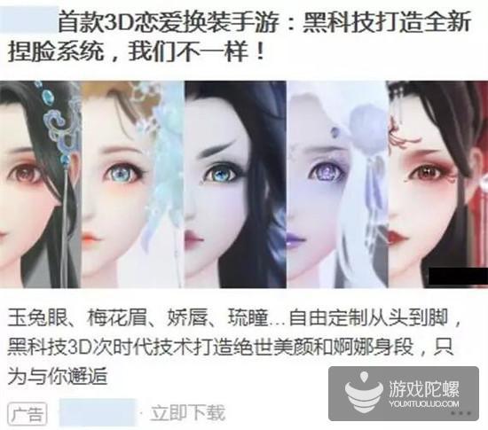 ① 妆容搭配,文案用免费尝试不同妆容来引导用户,素材展示不同的妆容,偏向日常并且大多女性用户都想尝试的妆容,增加用户对游戏的好奇。