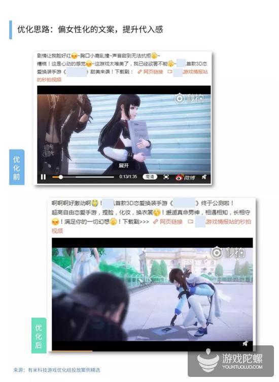 通过剧情剪辑,将两人之间的故事线剪辑得更加密集,偏女生语气的文案,加深了用户对游戏的代入感,成功提升了互动,降低了成本。