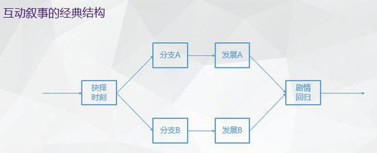 互动叙事作品的结构也尤为重要但往往会被误解,习惯了传统方式的故事创作者,经常选择用跳过戏剧冲突或用不合理的结局来突然结束故事的方式来制造分支。这样的结构,本质上与传统叙事没有差别。甚至,由于无意义分支的加入,使得故事整体的体验质量大打折扣。六边形则是最经典的互动叙事结构,既保留了故事发展的总体方向,又提供了用户对于剧情走向的影响空间。传统叙事中的技巧,也能够被完全保留。
