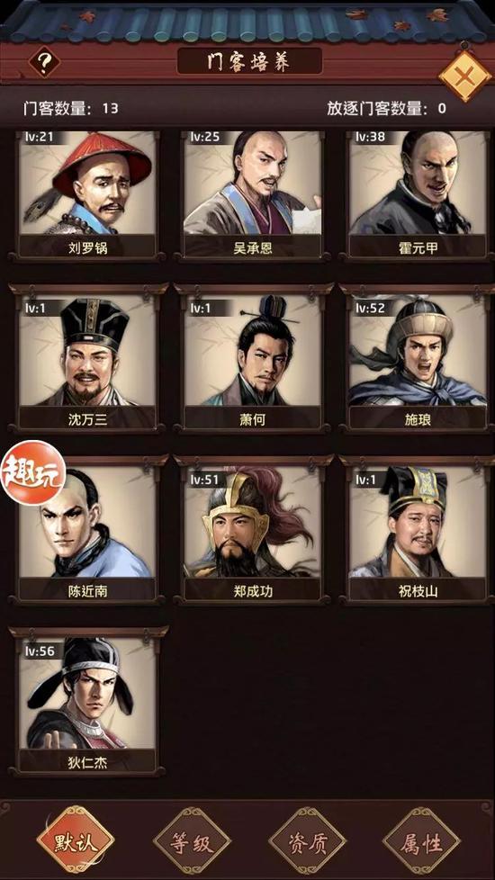 门客属性与能力在一定程度上决定了玩家的推图效率,当然,与军队数量相比,门客起到的作用更多在BOSS战中。但《官场风云》的数值设计十分奇怪,在中前期的战斗中,门客经常秒杀BOSS。与大部分升官手游的设计不同,《官场风云》中可以招募的门客不止有影视剧作品中常见的韦小宝、纪晓岚、刘罗锅等清朝角色,还把历史上叫得上名字的人物都拿来做了个门客大杂烩。其中不乏狄仁杰、萧何等横跨千年历史的人物,颇有种关公战秦琼的味道。