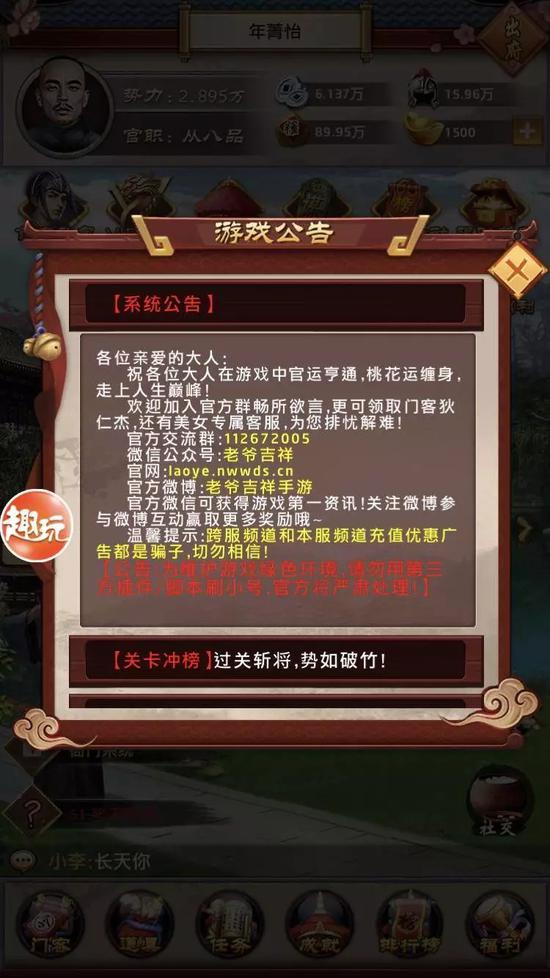 每个抱着猎奇心理下载游戏的人,进入到当官手游后估计都会大失所望。这些游戏同质化极为严重,几乎就是同一款游戏。《官场风云》当属这类当官手游的代表与翘楚。
