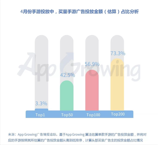 在整体手游广告投放中,对各手游的广告投放金额进行估算,投放金额榜首的手游占整体手游广告投放金额的3.3%,Top200的手游投放金额占比为73.3%,相对3月份波动不明显。