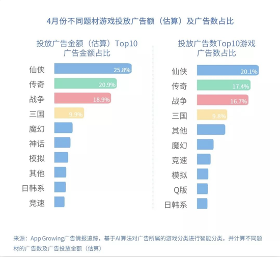 4月份投放广告金额(估算)居首位的是仙侠类游戏,占比达25.8%,其次是传奇游戏占比为20.9%,投放广告金额(估算)与投放广告数占比排行前四位保持一致。