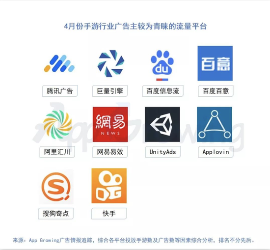 3.4月份手游广告主所青睐的Top 10流量平台:腾讯广告、巨量引擎、百度信息流、百度百意、阿里汇川、网易易效、UnityAds、Applovin、搜狗奇点、快手;