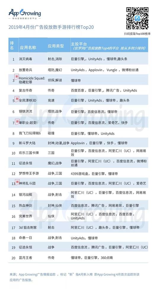 5.广告投放数手游推广排行榜Top 20中,《消灭病毒》广告投放力度大,侦探解谜类游戏;《Homicide Squad:隐藏犯罪》、竞速游戏《全民漂移3D》、传奇游戏《单职业:超变!》、战争三国游戏《神将乱斗团》为本月首次投放广告的游戏;