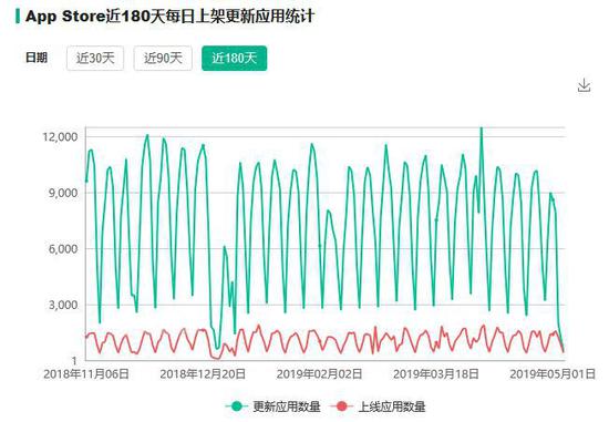 下图是App Store近180天每日上架更新应用统计,可以看出每天更新+新上线的APP超1万左右。“Today”推荐的APP在100左右(不去重),手机屏幕前三屏可以推荐4款APP左右。因此,一款上线APP想上前4位的概率是1/2500。