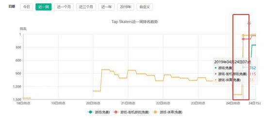 绝大多数App被“Today”推荐后,榜单排名明显上升,由一无名小卒变成一匹黑马。如果你的产品是被推荐到全球范围,那么APP榜单的排名效果更是可观的。如游戏应用“Tap Skaters”在4月24登上“Today”的“今日游戏”推荐位。排名从一千多名拉升到了31名。