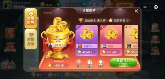 新进榜的《狐狸斗地主》,主要是依靠初始五局游戏让玩家获得红包的快速裂变机制。这个红包并不是现金奖励,而是积累金额的奖券,玩家可以在各类玩法中积累奖券,在游戏内换取虚拟道具,目前游戏并未加入现实商品类、话费兑换。除此之外,在残局挑战模式中积累金星,可以加入每周的金星排行,通过名次获得游戏币的奖励。