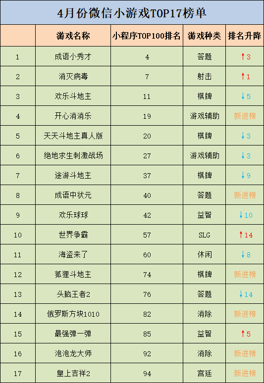 近日,阿拉丁指数发布了微信小程序4月TOP100榜单,其中共有17款小游戏产品进榜。4月份微信小游戏生态发生了哪些变化,哪些产品名列前茅,哪些产品爆发了新的潜力呢?笔者根据小程序TOP100榜单整理出微信小游戏4月TOP17榜单,并根据上榜产品近期表现进行综合分析,希望为开发者们提供助益。