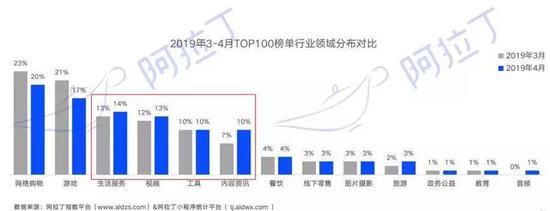据阿拉丁指数统计,4月份小程序TOP100榜单中小游戏数量继续低于电商类小程序,而且上榜产品再次减少了4款。生活服务、视频、内容资讯等行业则在上榜数量中稳步上升,小程序生态展现出均衡且多元发展的趋势,小游戏去年一家独大的情况已经连续2个月不再出现。