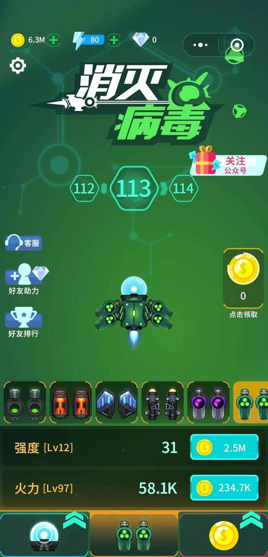 美术设计上,《消灭病毒》将每个病毒都加上了数字和单位标示,随着玩家关卡的提升,病毒身上的数字随之提升,数字越大的病毒需要更强的火力才能消灭。而玩家消灭病毒获得的金币,可以用来提升主武器、副武器和日常挂机收益,通过观看激励广告可以获得3倍及以上的金币收入。《消灭病毒》也通过武器升级系统、日常收益系统来维持用户的持续留存,并通过激励广告提升产品的收入。