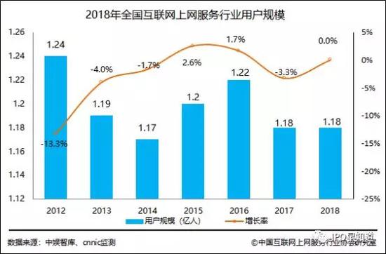 互联网上网服务行业流量下沉是不争的事实。我国上网服务场所总营收已连续两年下降,2018年为706亿元,较2016年最高点740亿元下降34亿元;同期用户规模1.18亿人,和上年保持不变,但已是近七年来次低。