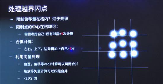 处理偏移的时候,会出现越界的问题,就会出现截断的情况,看起来比较奇怪。处理越界闪点的方式,就是随着点随机缩小,把偏移量限制在格内。但是这样过于规律,几乎看不出什么变化。后来我们发现只要限制点的中心在格里就可以了,这样一共是自己加周围8个邻居,共9次闪点相关的计算。可以利用一些情况来合并计算。由于点的中心不能出框,左邻居只会影响当前格左半边的像素,右邻居只会影响当前格右半边像素,左右两半边可以合并计算。同理,上下两邻居也可以合批计算,四个对角也可以合并计算。上下左右加边角加自己,只需要计算4次闪点相关计算。