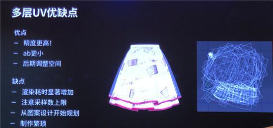 除了硬件和性能上的问题,多UV对于制作也有较大影响。设计时需要考虑图案规划,而制作时需要根据情况对UV进行调整和拆解。例如这个比较简单的裙子,它的UV是这样的。从另外一个方面,UV拆分过于灵活,也会导致这个流程难以推广和流程化。