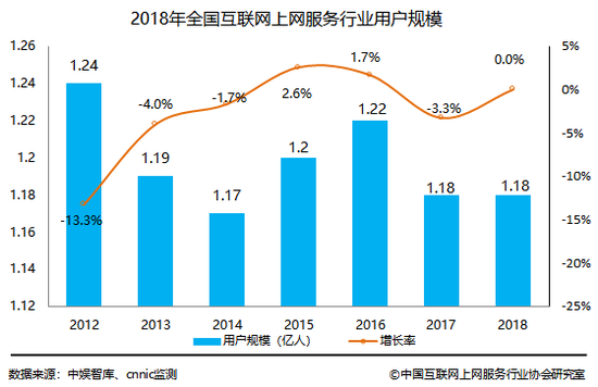 眼下,互联网上网服务行业流量下沉是不争的事实,我国上网服务场所总营收已连续两年下降,2018年为706亿元,较2016年最高点740亿元下降34亿元;同期用户规模1.18亿人,和上年保持不变,但已是近七年来次低。