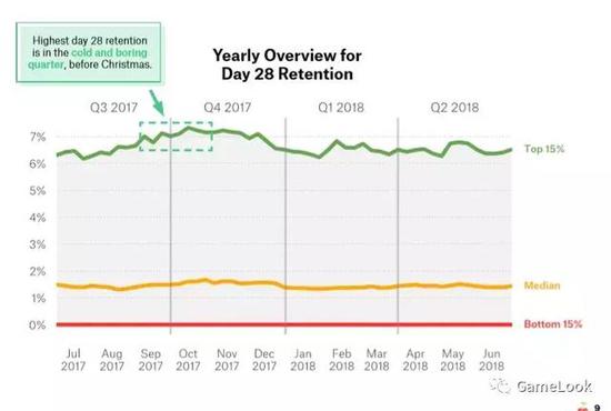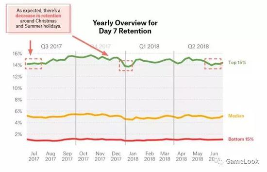 和次留一样,七日留存率也是非常关键的数据,整体来说,七日留存超过15%才算是有希望的游戏,在圣诞节和暑假期间,七日留存率会出现下滑。