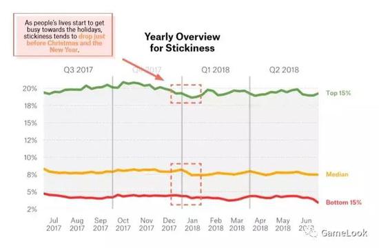 用户参与度方面,报告给出的算法是DAU/MAU=用户粘性,意味着每一天的MAU玩家比例。大多数的游戏玩家粘性都会在新年和圣诞节之间出现下滑,新年之后则缓慢爬升。