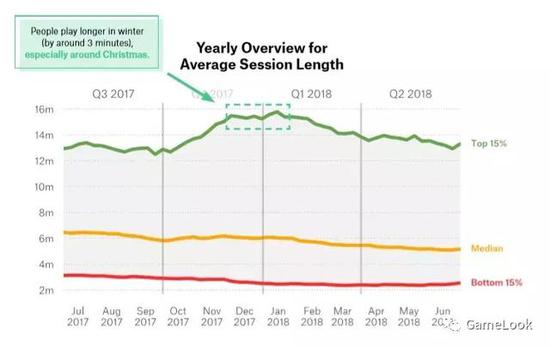 GameAnalytics表示,手游玩家们的平均游戏时长在冬季最久,比往常多了三分钟,圣诞节期间则更长一些。