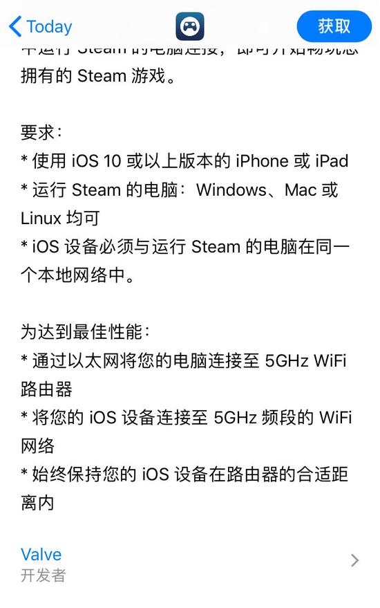 从应用信息页面来看,Steam Link的使用条件并不简单。不仅要求IOS设备和Steam电脑处在同一个本地网络、距离不能太远,而且这个Wifi网络还得是5GHz频段。