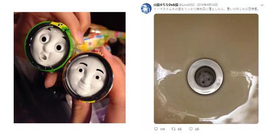 2014年,日本糖果厂商做出了一款托马斯糖果,糖果桶的盖子就是托马斯的脸,商品大卖特卖。但不久后,一位日本网友发推表示,自己的托马斯糖果盖子不小心掉到了洗手盆的排水口上,这一幕让他感到十分恐怖。
