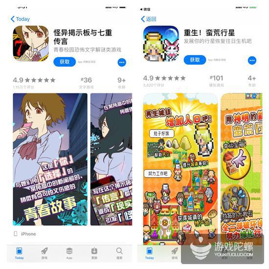 因此,除了TapTap外,扑家的产品也经常获得苹果的推荐,比如星评4.9的《重生!蛮荒行星》、《最后他对我说》,以及被推荐3次的《怪异揭示板与七重传言》等。