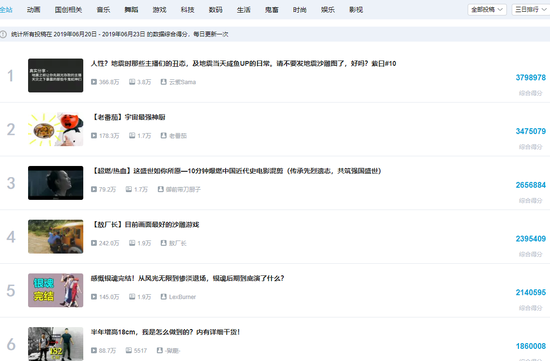虽然“二次元”是长期以来紧紧贴在B站身上的标签,但如上所述,UP主们的创作实际覆盖许多圈层。从B站全站排行也可以看到,B站上最受关注的内容跟二次元关系不大。