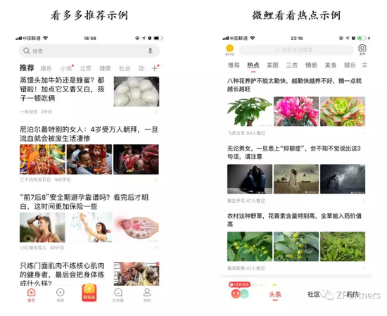 ZP发现不同新闻资讯类app的内容差异明显。头条内容最全也最正,趣头条内容更猎奇,百度旗下的“看多多”更养生,中华万年历推出的“微鲤看看”更三农。不同的精神食粮送给了不同口味的读者,大家各取所需。
