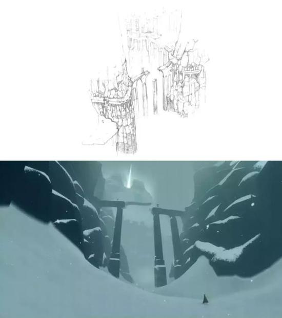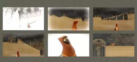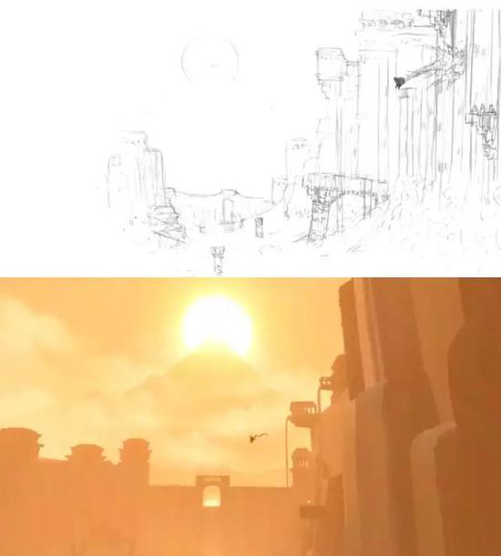 实际上在后来的游戏里,我们也是大致按照这个思路做的,你可以从这张图看到《风之旅人》场景的变化。