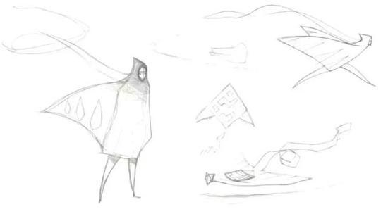 后来我又尝试用衣服来表现角色,通过衣服的舞动来表现角色的动态感,为此画了很多草图,甚至做了一个角色来表达游戏的感觉: