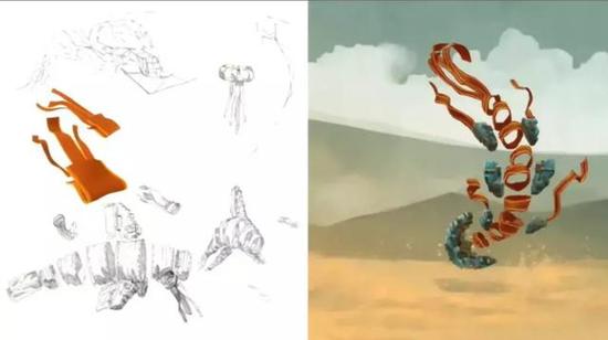 我们最先尝试了沙虫的想法,很长一段时间,我们都用了这样的形象,但最后我们发现,如果想让玩家们在游戏里和他们互动,这种生物是行不通的。