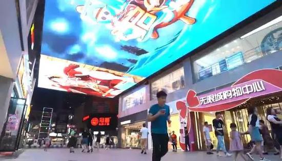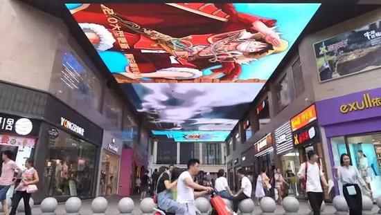 而上海、三亚、南昌、郑州的天幕,则是为所有逛街人士带来了“一抬头”的惊喜。长达百米的巨幕架设在商业区的天花板位置,游人进入商业区后很难不被这个“天幕”所吸引。在这四个城市的巨幕循环播放2.0特殊影像,让观者有了更强的代入感,对于吸引核心IP粉丝,以及让粉丝在圈层传播也提供了较佳的谈资。