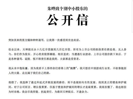 朱晔在公开信中承认公司通过外延式并购发展带来的问题,但是强调从未中饱私囊。他称,“天神娱乐上市以来,我有没有高位减持过,有没有通过减持股票获利?为了公司的股价,我一次次增加锁定期,你们心里没数?‘中饱私囊’的罪名安在一个一股没卖的董事长身上,多有意思。”