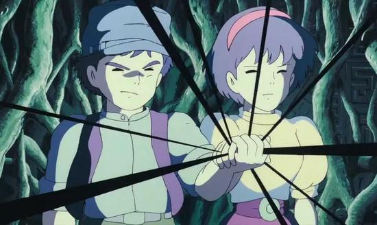 仍以《天空之城》为例,这个故事采用的是传统的少年冒险结构,以正义的少男少女战胜邪恶的“黑眼镜”集团为主线。在这个看似简单的故事里,正邪双方的核心冲突是对于少女席达项坠上的飞行石的争夺。这枚宝石是激活古老军事技术的密钥,也可以看作是对现代技术的隐喻。充满野心的“黑眼镜”想要借助飞行石的力量来征服世界,孩子们的任务则是阻止这一切。最终,他们通过吟出自毁的口令让空中堡垒彻底瓦解,并由此挫败了反派,拯救了世界。