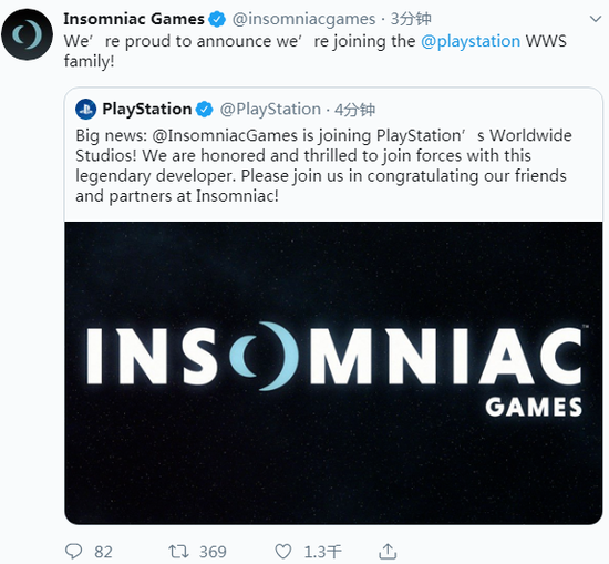8月20日,索尼宣布《漫威蜘蛛侠》工作室Insomniac Games将会成为PlayStation全球工作室的一员,随后Insomniac转发表示,他们很高兴能够成为大家庭的一员。此前的知名作品有《瑞奇与叮当》和《日落过载》。
