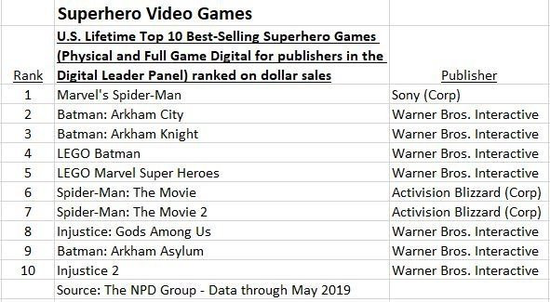 另外,索尼互娱官方新闻中的数据显示,截止今年7月28日,于2018年9月7日在PS4平台独占发售的《漫威蜘蛛侠》全球销量已经达到1300万份。据之前的NPD数据报告显示,《漫威蜘蛛侠》已经超过《蝙蝠侠:阿卡姆之城》成为全球销量第一的超级英雄游戏。