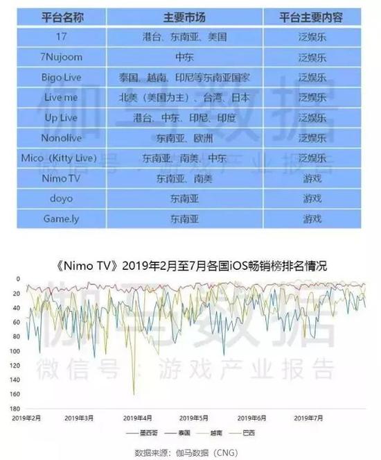 国内游戏直播行业市场经过近几年的发展后格局逐渐固定,斗鱼和虎牙头部位置难以撼动,国内直播领域的发展空间越来越小,各大企业开始在内地以外地区以及海外寻求新的市场机会。2015年开始,17、7Nujoom等以泛娱乐业务为主的直播平台打开了东南亚等地区的市场,随着资本的注入及技术和商业模式的不断成熟,越来越多的直播平台尝试在东南亚等地区开辟市场。国内的直播平台也纷纷布局海外市场,斗鱼参与投资出海移动视频直播平台Nonolive;触手在东南亚市场推出游戏直播平台Game.ly;虎牙也推出游戏直播平台Nimo TV进军东南亚及南美市场,在印尼、越南、泰国、巴西、墨西哥等多个国家的畅销榜位居前列。
