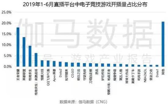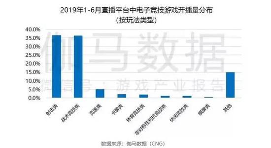从伽马数据统计的直播平台中各类型的电子竞技游戏开播量数据来看,2019年1-6月,射击类和战术竞技类游戏的开播量要明显高于其他类型,两种类型的电子竞技游戏开播量合计占比超过70%,是电子竞技游戏直播的主要构成部分。
