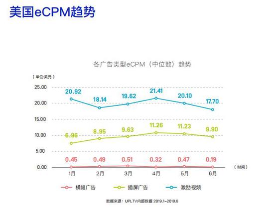 各种广告类型在美国的eCPM水平均处于海外市场的领先地位。综合来看,今年上半年的1月份和4月份是广告变现效果最好的时刻。