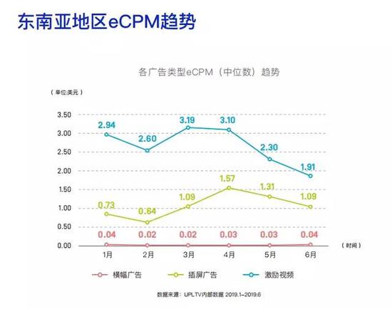 东南亚地区的广告eCPM水平整体较其他地区偏低,在上半年末期的下降幅度较大。