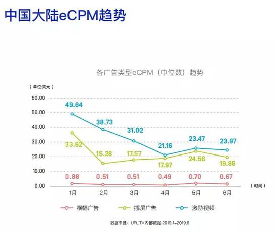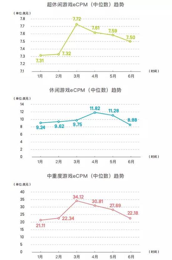 超休闲、休闲和中重度游戏在2019年上半年eCPM趋势波动大致相同,ARPU值最高的是休闲游戏,因为其广告强度高于中重度;主要依靠内购来营收中重度游戏的广告ARPU值则是最低的。