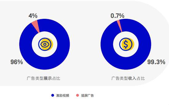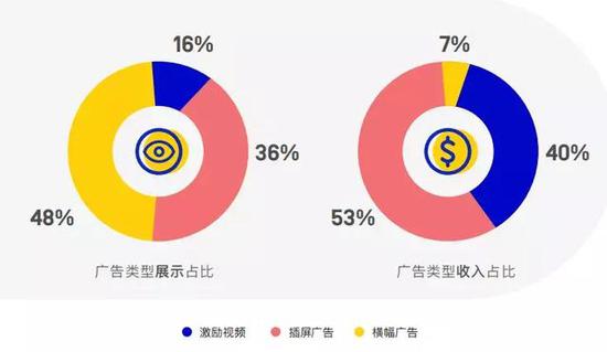 在以内购为主的中重度游戏中,最适合的类型则毫无疑问是激励视频广告,无论在展示占比还是收入占比上都有绝对的优势。