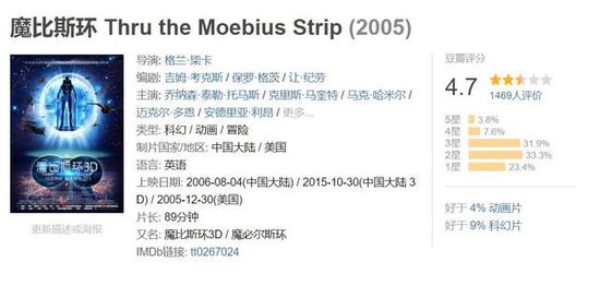 《魔比斯环》上映后,由于技术水平不够,再加上剧本并不是一个“接地气”的剧本,导致票房惨败,365.1万。如果去豆瓣上“考古”,还能看到有人评论说:“观众花钱难道是为了给国产动画做贡献吗?你以为这是缴纳个人所得税吗?”